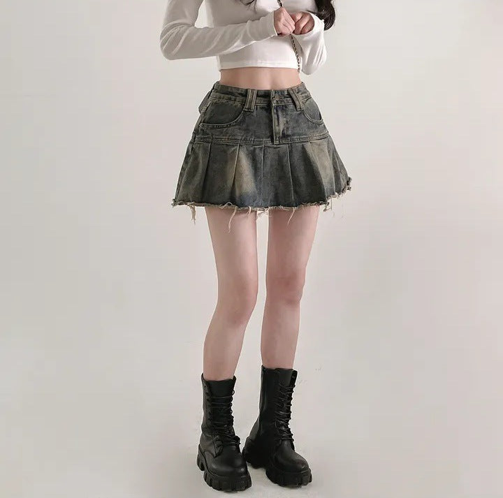 2000s fashion Hot Girl Retro Frayed Skirt Denim Women's New Washed Distressed Design High Waist Slimming Pleated Skirt