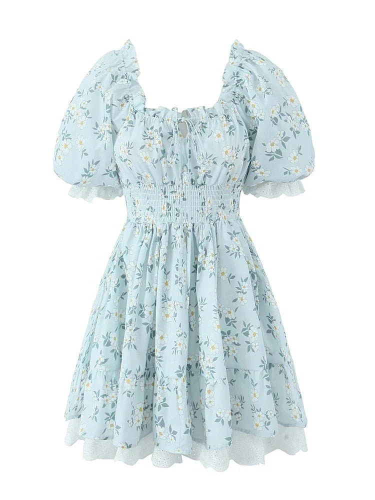 The Amica Dress is a sweet. blue floral dress perfect for casual outings. Its puff sleeves and delicate floral print make it an eye-catching addition to your wardrobe.