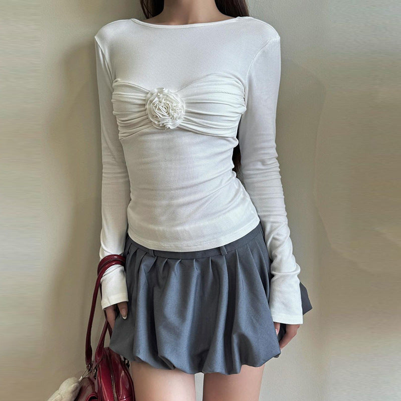android vs cyberborg dress to impress Three-Dimensional Flower Decoration round Neck Long Sleeve Slim T-shirt Sexy Big Backless Waist Slimming Hot Girl Top