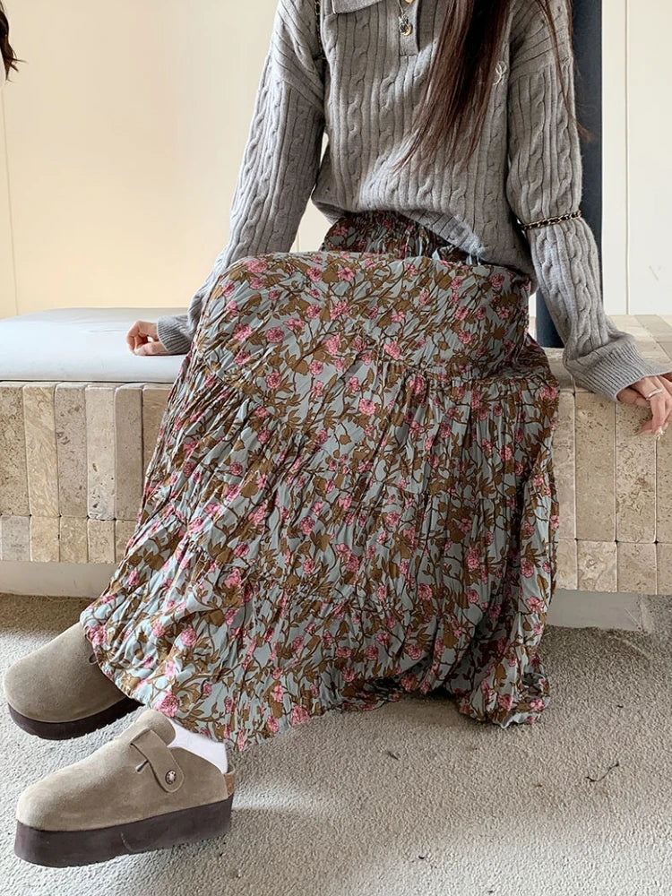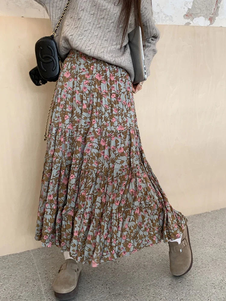 Ifomt Autumn Winter Wrinkled Floral Pleated Skirt Women Korean Style Casual High Waisted A-Line Midi Long Skirts Maxi falda plisada