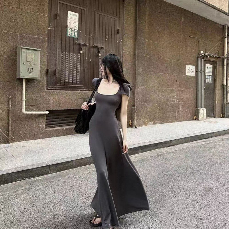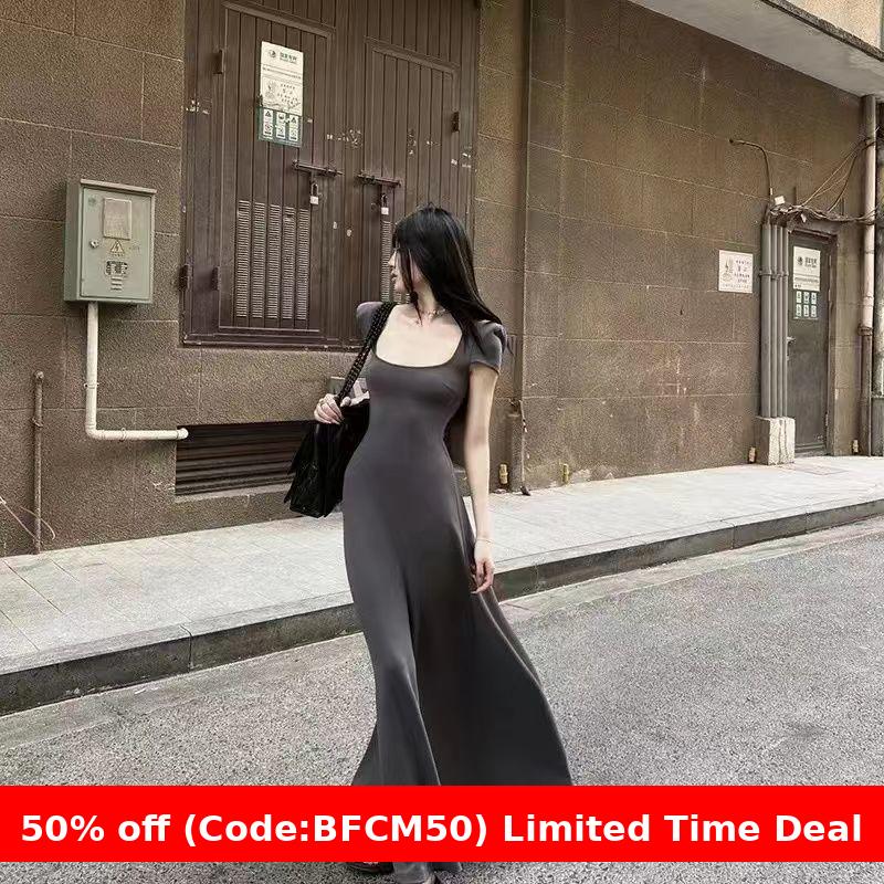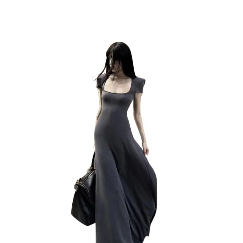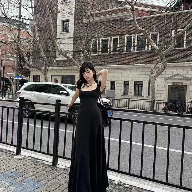 black sweater dress outfit Sweet Hot Girl Summer Tea Break French Square Collar Short Sleeve Dress Stunning Slim Fit Waist-Tight Temperament Long