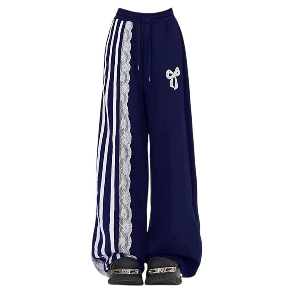 These aesthetic wide-leg pants combine a sporty stripe design with lace trim. They feature a loose fit. lace accents. and a decorative bow for a blokette vibe