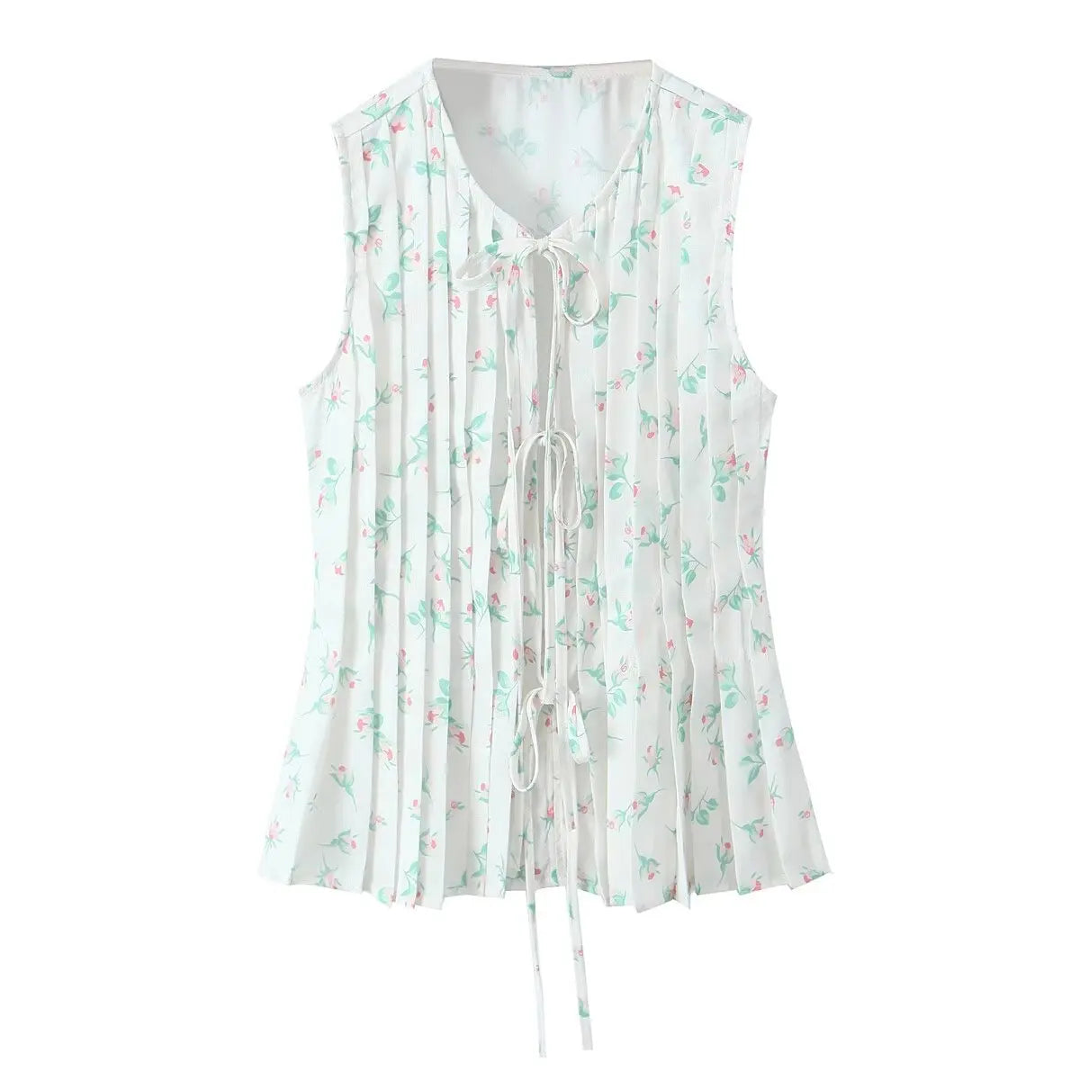 The **Blueberry Top** is a sweet and stylish piece that combines pleats with a delicate floral pattern. This sleeveless top is perfect for warm days and pairs well with any casual outfit. The ties at the front add a playful touch to its design.