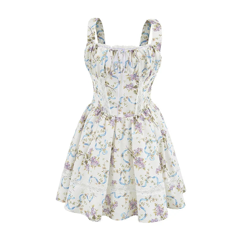 The Britta // Dress is a fairytale come to life. This floral mini features a softly structured corset bodice. gathered bust. lace trim. and a flared skirt with a high-low hem. Whether twirling in a field or heading to tea. it's made for the moment.