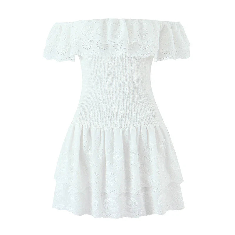 The Bronde // Dress is the ultimate off-shoulder mini for sunny days and garden picnics. Its smocked bodice flatters the figure. while the embroidered tiered hem adds movement and charm. Effortlessly romantic and easy to style.