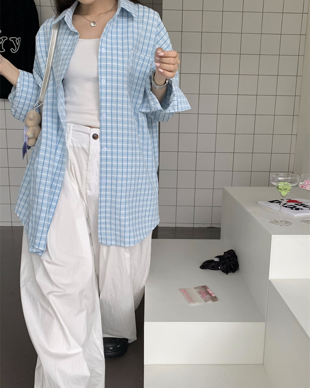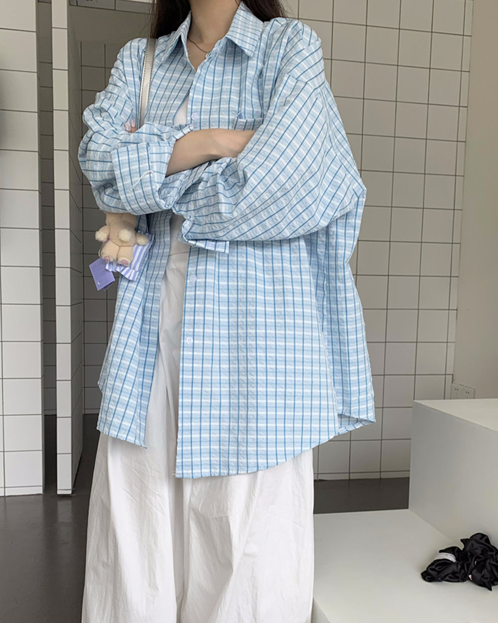 This oversized shirt features soft baby blue plaid. dropped shoulders. and a relaxed button-up cut