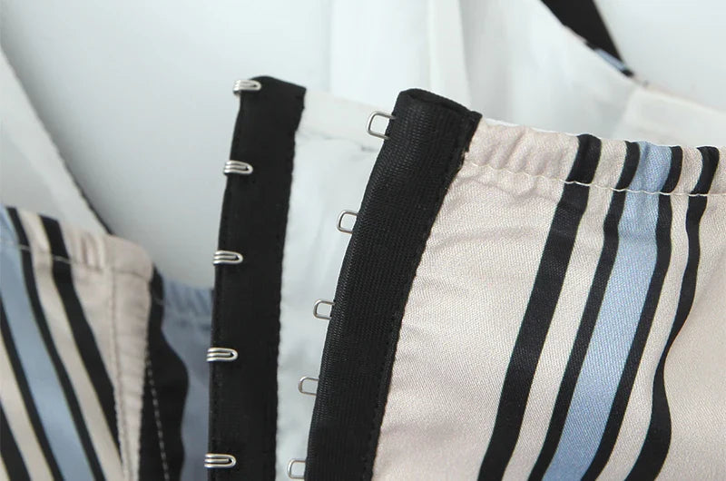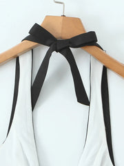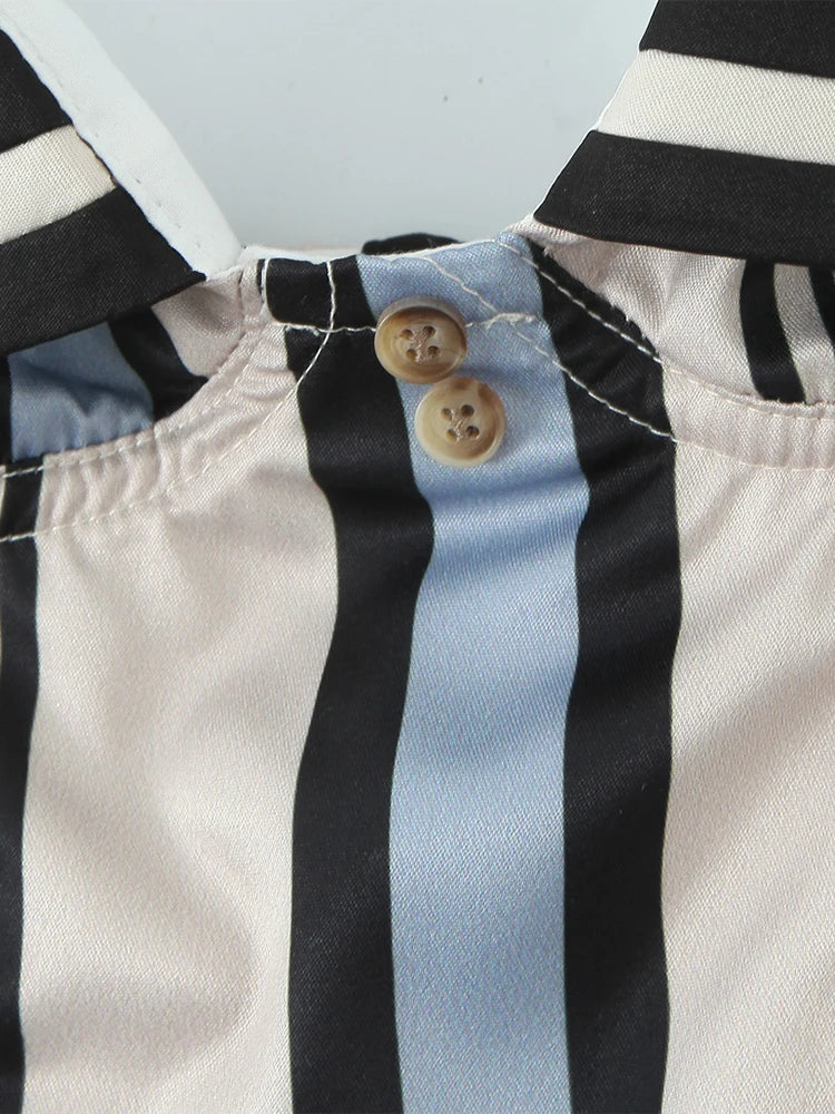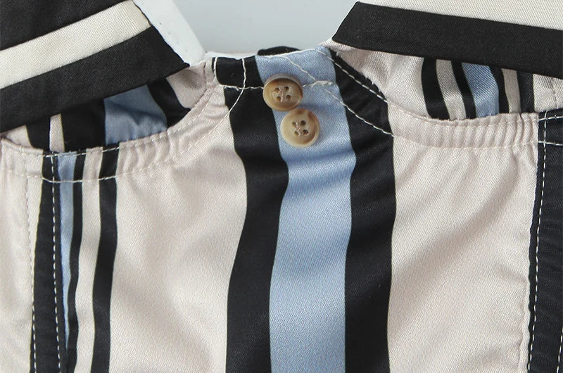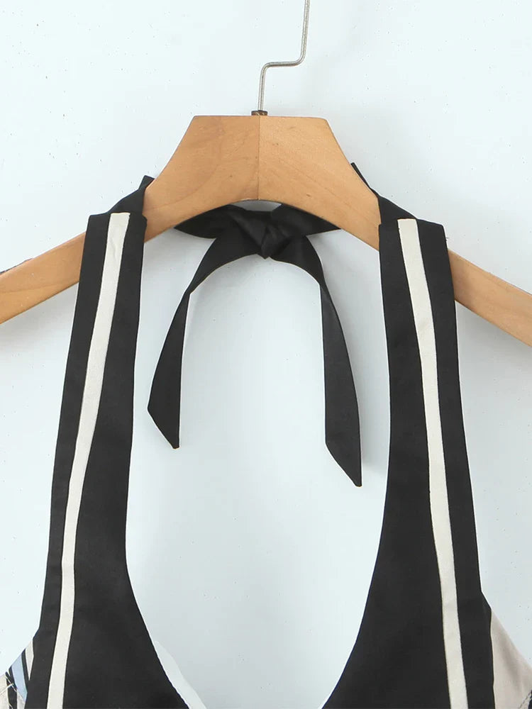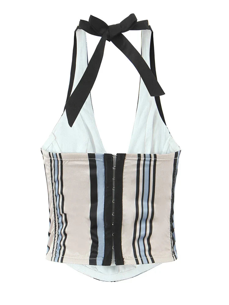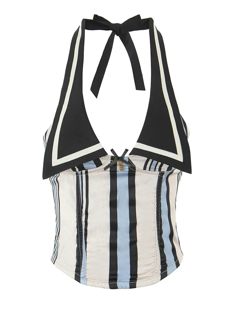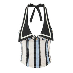 The Carlota // Top is a sailor-inspired halter with bold contrast collar and retro stripe paneling. Cropped and fitted. this top brings a nautical twist to your wardrobe with playful sophistication and a cheeky charm.