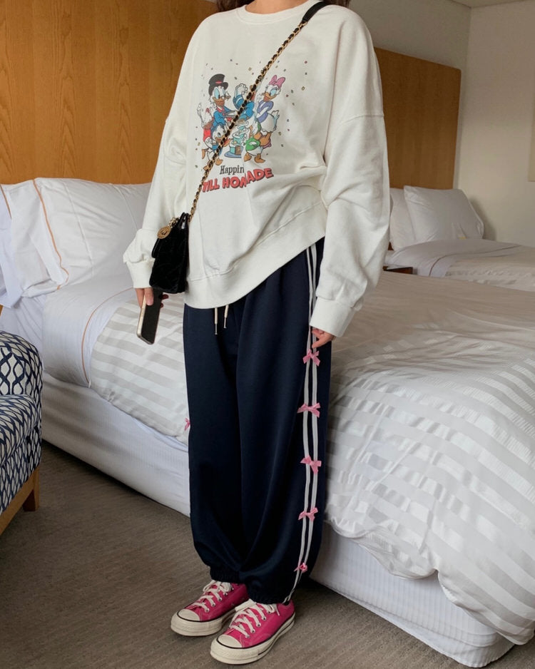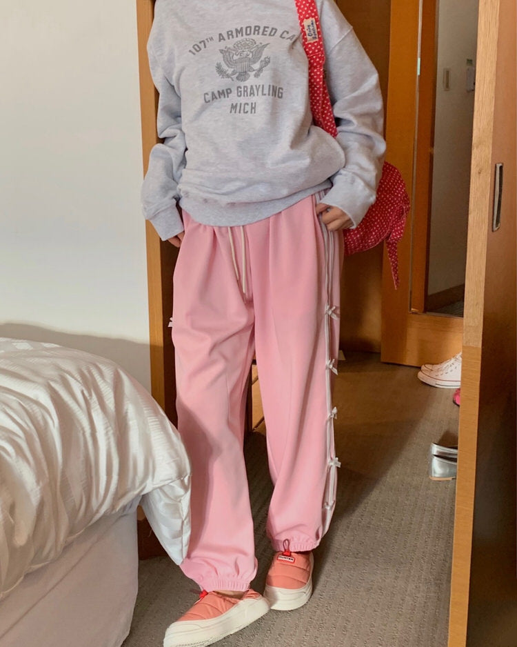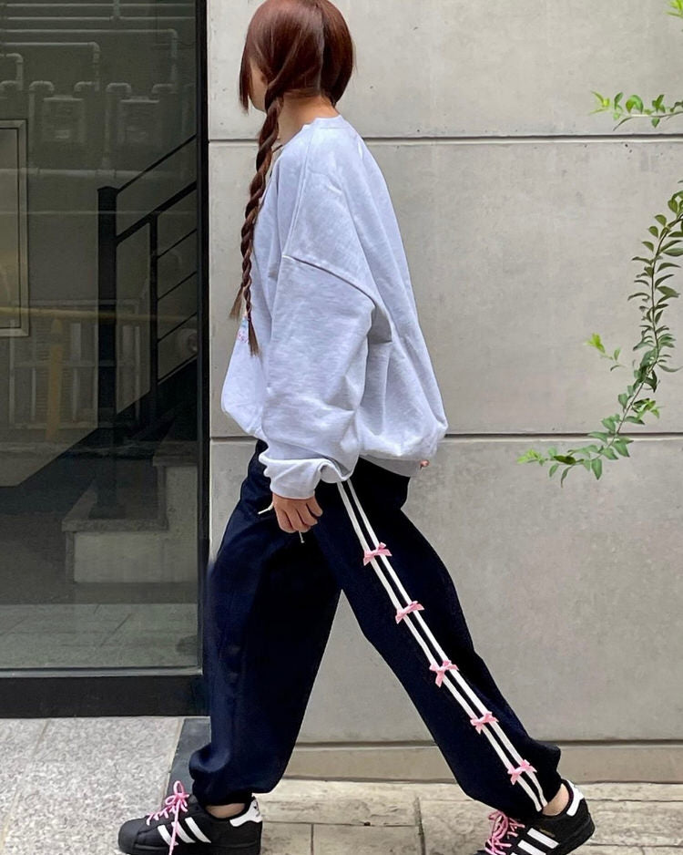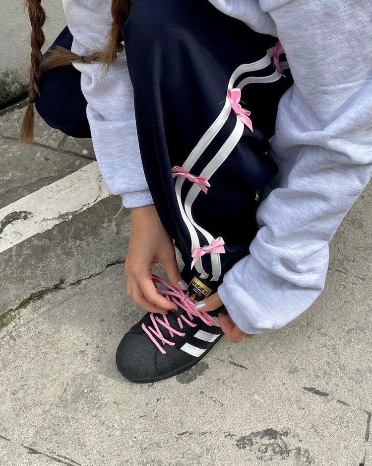 This Coquette Bows Pants featuring white side stripes adorned with pink bows. embodying a charming coquette aesthetic. Perfect blend of sporty and sweet