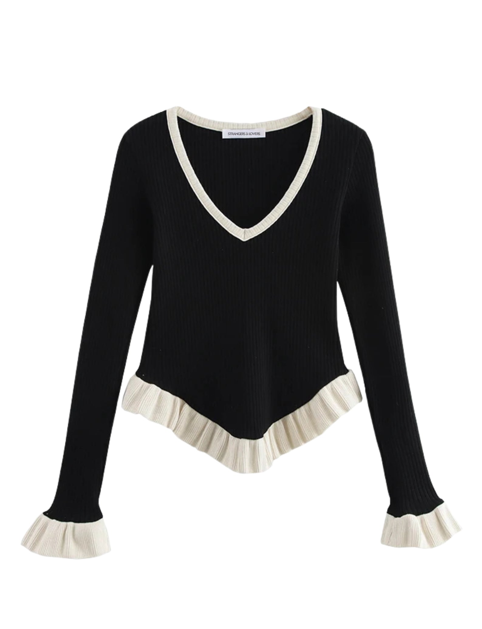 The Cou Cou Top is a stylish and comfy top. designed with a unique ribbed fabric and frill details around the neckline and sleeves. The V-neck style and fitted design make it perfect for a casual day out or paired with a skirt for a cute look.