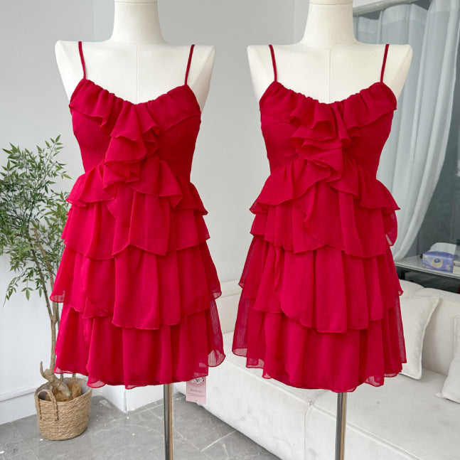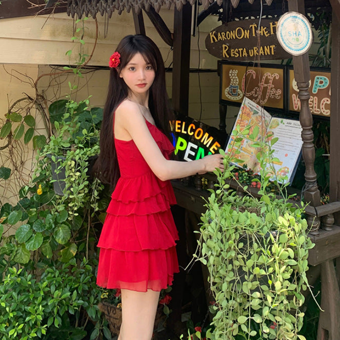 dress to impress codes Pure Desire Style Red White Sling Dress Women's 2024 Summer New Design Sense Waist Slimming Cake Skirt