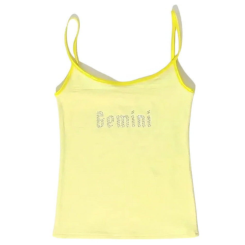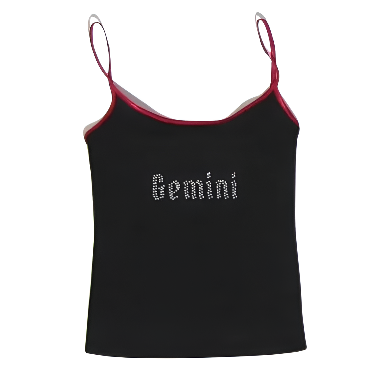 Y2K Style tank top with sparkling "Gemini" text in rhinestones