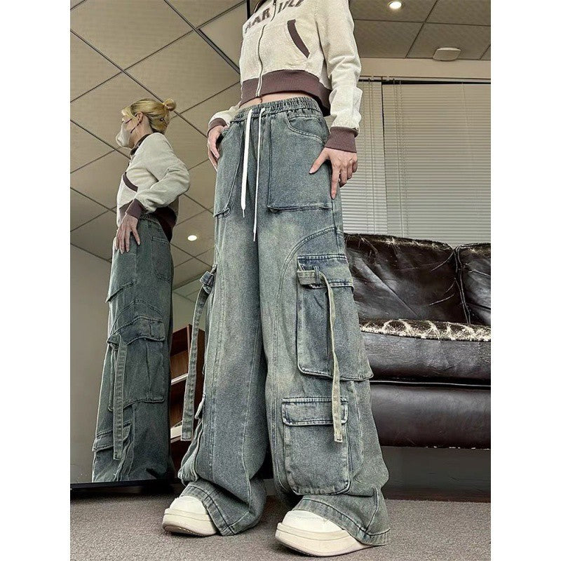 hipster dress to impress Elastic Waist American Retro Wide Leg Meat Covering Straight Harem Loose New Washed Denim Overalls Women's Daddy Fashion