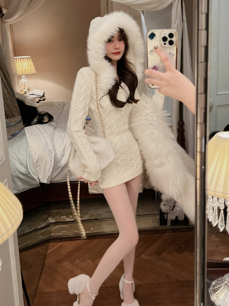 Knitted Faux Fur One Piece Sweater Dress Details: