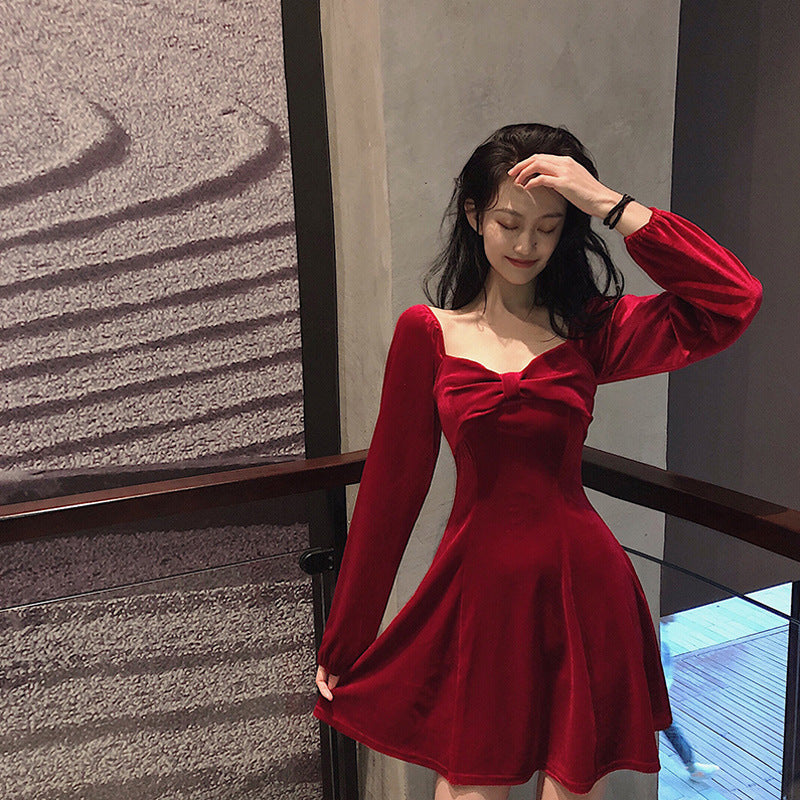 leapord halloween outfit French Style Dress New Year Clothes Women's Battle Dress Hepburn Style Velvet Dress Red Retro Square Collar Bottoming Dress