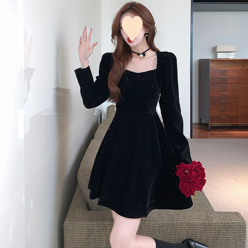 leapord halloween outfit Lace-up Velvet Dress Slimming Bow Winter French Retro Red Fairy Short Skirt