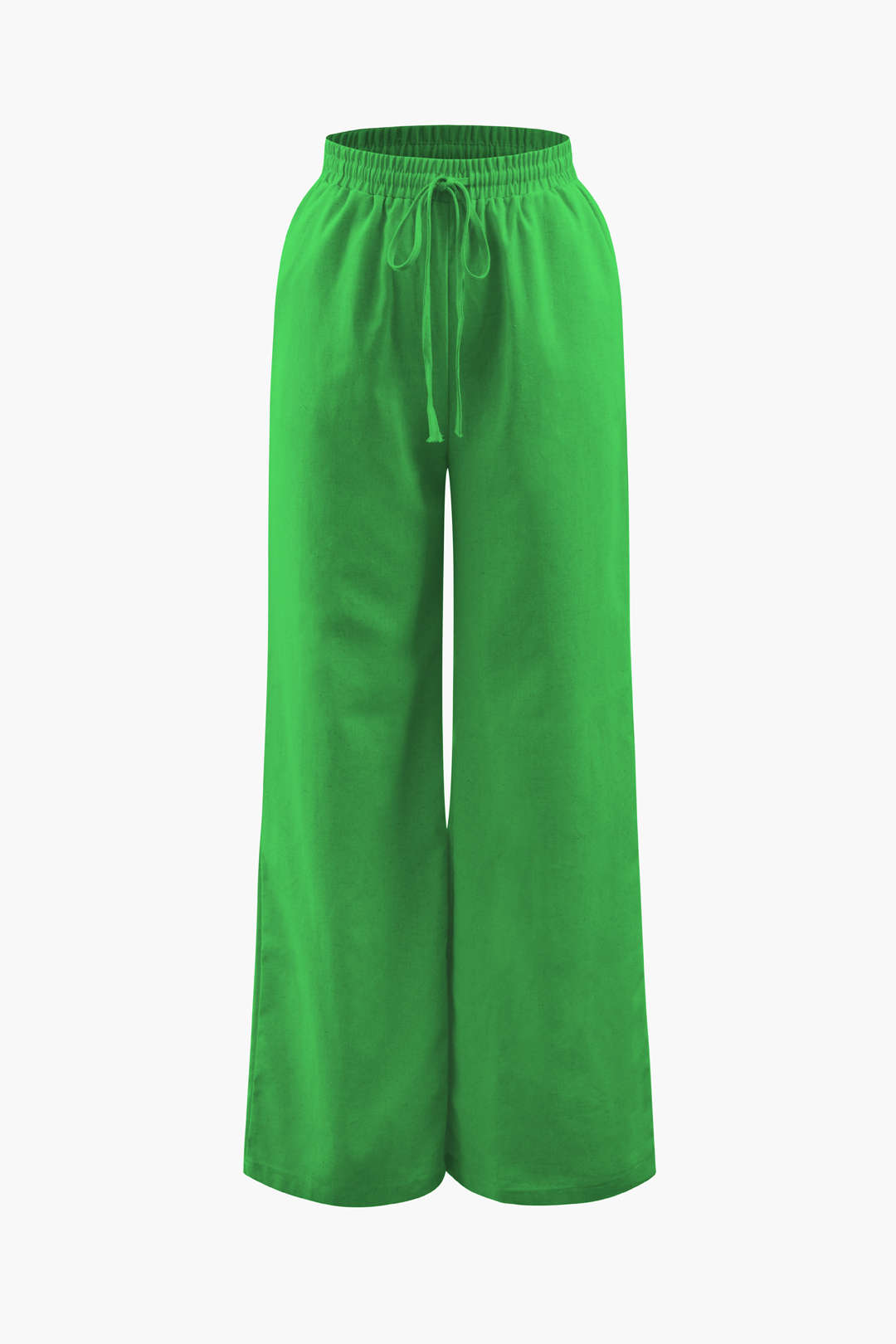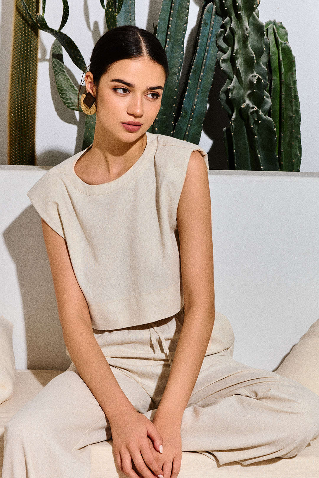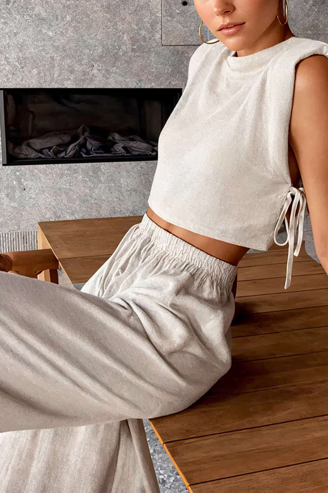 Linen Padded-Shoulder Tie Side Top And Drawstring Pants Set