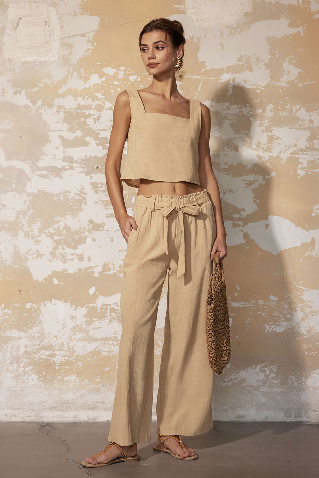 Solid Cami Top And Pleated Wide Leg Pants Set